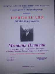 За свою витирвалу роботу у просвити учителька достала вецей припознаня и награди, а єдно з нїх и Припознанє „Осиф Фа, учитель” Дружтва за руски язик, литературу и културу 2016. року за длугорочну воспитно-образовну роботу зоз школярами. Учителька Меланка Планчакова була член Дружтва за руски язик, литературу и културу од 1974. року. У мат. кнїжки Дружтва уписана є под числом 68.